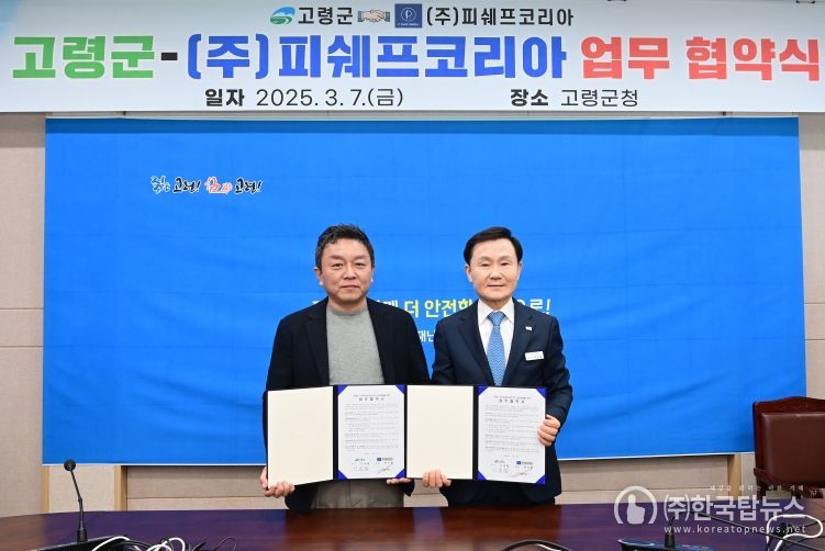 ㈜한국탑뉴스 차복원 기자 | 고령군은 지난 3월 7일 고령군청 우륵실에서 ㈜피쉐프코리아(대표 박기태)와 지역농산물 홍보를 위한 업무협약을 체결했다.