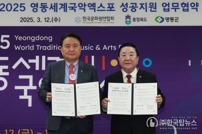 ㈜한국탑뉴스 한민석 기자 | 영동세계국악엑스포조직위원회(이하 조직위)는 3월 12일 충북도청 소회의실에서 한국문화원연합회(회장 김대진)와 영동세계국악엑스포(이하 엑스포) 성공개최를 위한 업무협약을 체결했다고 밝혔다.