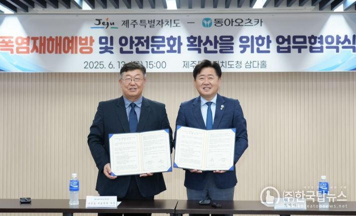 제주도는 13일 오후 도청 삼다홀에서 동아오츠카와 ‘폭염 대응 및 온열질환 예방을 위한 업무협약'을 체결했다.