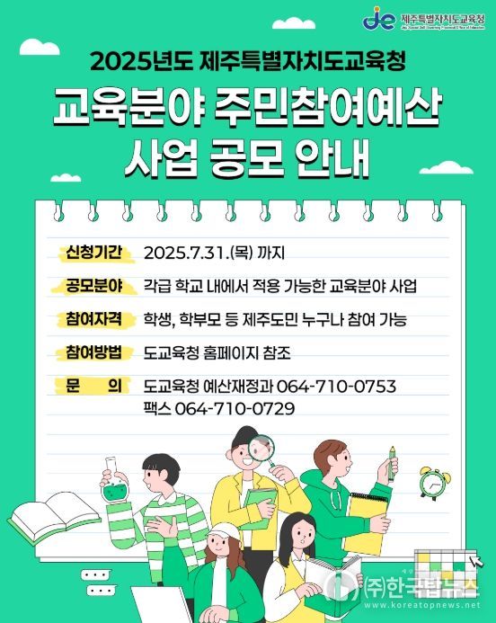 ㈜한국탑뉴스 차복원 기자 | 제주특별자치도교육청은 오는 7월 말까지 2026년도 예산 편성에 앞서 학교 현장과 도민의 목소리를 반영하기 위한 ‘주민참여예산제’ 공모를 진행한다고 밝혔다.