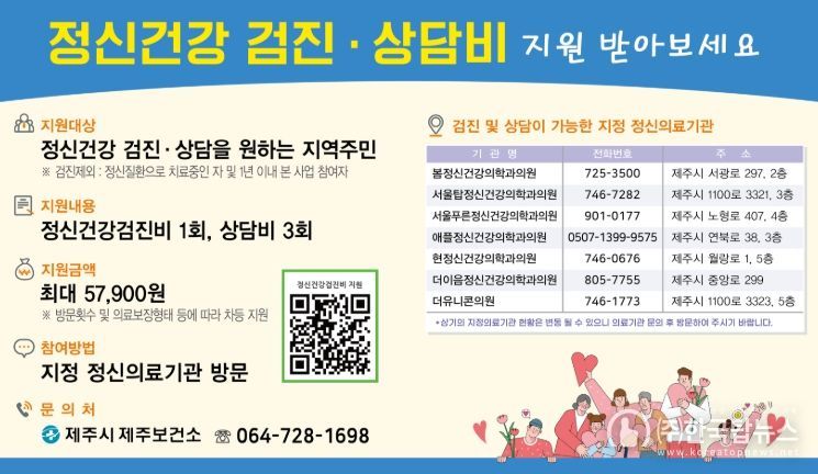 ㈜한국탑뉴스 차복원 기자 | 제주보건소는 시민의 정신건강 위험요인을 조기에 발견하고 적절한 치료를 유도하기 위해 ‘정신건강검진비 및 상담비’를 지원한다.