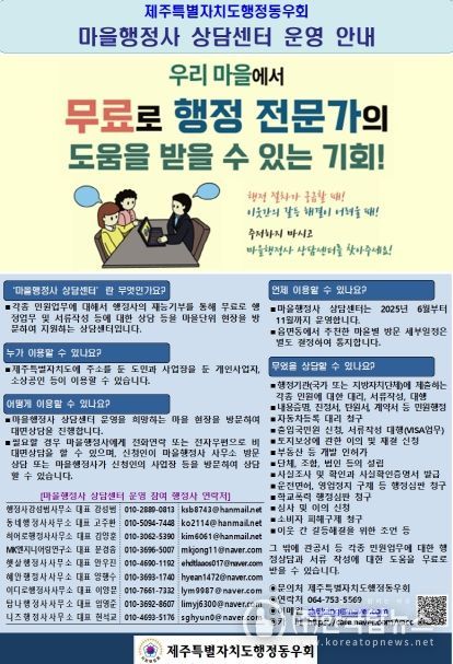 ㈜한국탑뉴스 차복원 기자 | 제주특별자치도행정동우회는 2025년 행정동우회 공익활동 지원사업인 ‘마을행정사 상담센터 마을단위 순회운영’을 6월부터 시범운영을 추진한다.
