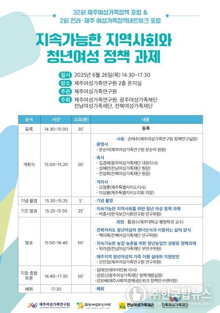 ㈜한국탑뉴스 차복원 기자 | 제주여성가족연구원은 6월 26일 오후 2시 30분 제주여성가족연구원 2층 온지실에서 “지속가능한 지역사회와 청년여성 정책 과제”란 주제로 제32회 제주여성가족정책포럼을 개최한다.