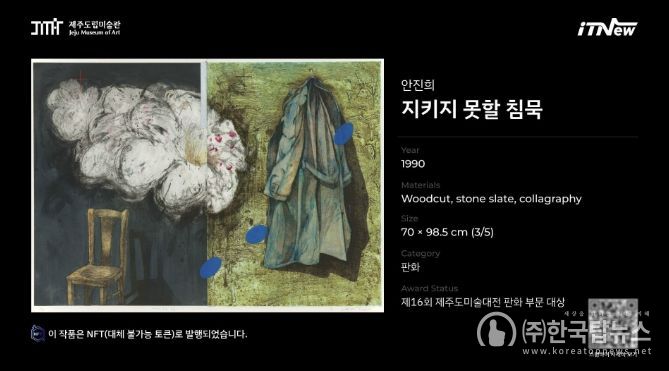 ㈜한국탑뉴스 차복원 기자 | 제주창조경제혁신센터(대표이사 이병선)는 보육기업인 ㈜잇뉴(대표 고병욱)가 제주도립미술관과 협력해 NFT(대체 불가능 토큰) 기반의 디지털 작품 전시를 성공적으로 개최하며 예술과 기술의 새로운 융합 사례를 선보였다고 밝혔다.