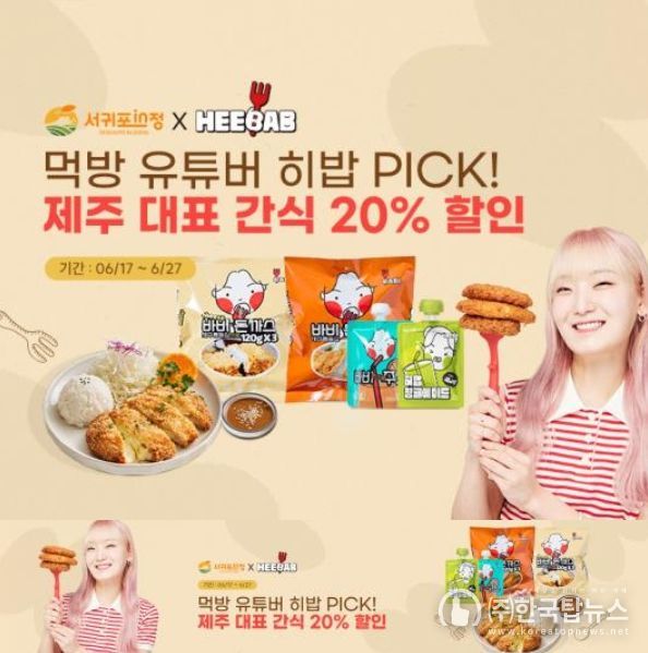㈜한국탑뉴스 차복원 기자 | 서귀포시에서는 제주 출신 유튜버 히밥이 소속돼있는 ㈜위드라이크가 농수축산 온라인 쇼핑몰 ‘서귀포in정’에 신규 입점한다고 밝혔다.