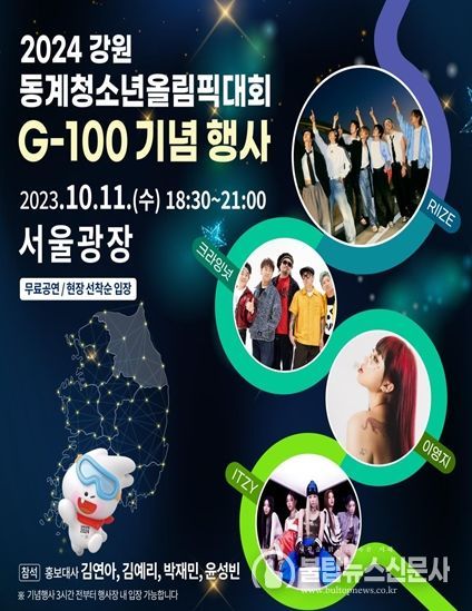불탑뉴스 기자 | 강원특별자치도는 ’23년 10월 11일 저녁 6시 30분, 서울광장에서 '2024 강원 동계 청소년올림픽대회 G-100 기념 행사'를 개최, 올림픽 대회 붐업 분위기 확산에 나선다.