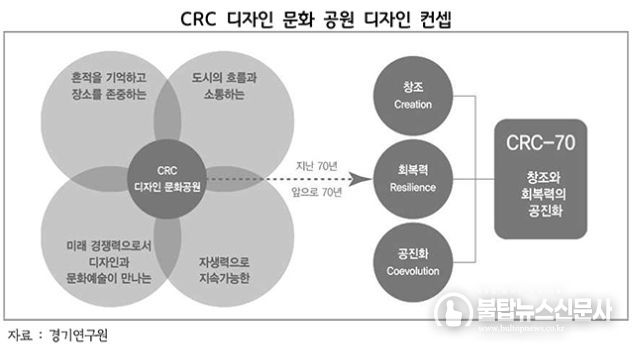 이에 연구원은 근현대 역사적 가치를 보유하고 있는 캠프 레드클라우드(CRC)의 장소적 특성을 재발견하고 공간 특성에 의해 축적된 경험의 가치를 콘텐츠로 활용하고자 ▲흔적을 기억하고 장소를 존중하는 캠프 레드클라우드(CRC) 디자인 문화 공원 ▲도시의 흐름과 소통하는 캠프 레드클라우드(CRC) 디자인 문화 공원 ▲미래에 경쟁력을 갖추기 위한 역량으로서 디자인과 문화예술이 만나는 캠프 레드클라우드(CRC) 디자인 문화 공원 ▲자생력으로 지속가능한 캠프 레드클라우드(CRC) 디자인 문화 공원의 4가지 기본구상과 함께 캠프 레드클라우드(CRC) 공간 특성을 고려한 6개 구역별(스포츠, 지역관광, 미래에너지, 디자인, 상업, 지역산업) 클러스터 조성 방안을 제시했다. 향후 70년 창조(Creation)와 회복력(Resilience)의 공진화(Coeveolution)를 이루는 디자인 문화 공원을 상징하는 개념인 ‘변화로 미래를 창조하는 CRC-70’을 도출, ‘CRC-70’의 브랜드화도 제시했다.