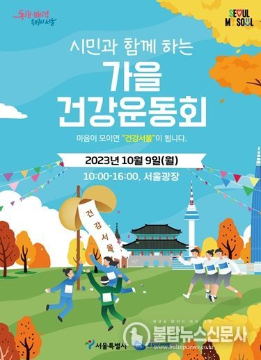 불탑뉴스 기자 | 서울시는 운동하기 좋은 가을에 많은 시민이 건강활동을 즐기며 실천할 수 있도록 10월 9일 서울광장에서 ‘시민과 함께하는 가을 건강운동회’를 개최한다. 광장에서 박 터트리기 등 추억 돋는 운동회, 주변 일대 걷기챌린지, 이야기 콘서트 등 일상에 활력을 불어넣을 수 있는 다채로운 행사를 진행한다.