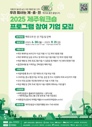 ㈜한국탑뉴스 차복원 기자 | 제주특별자치도와 제주관광공사(사장 고승철)는 오는 11월 21일까지 도외 민간기업 및 공공기관, 단체 등을 대상으로 ‘2025년 기업 워크숍 유치프로그램(JEJU Workshop)을 운영하고 있다고 1일 밝혔다.