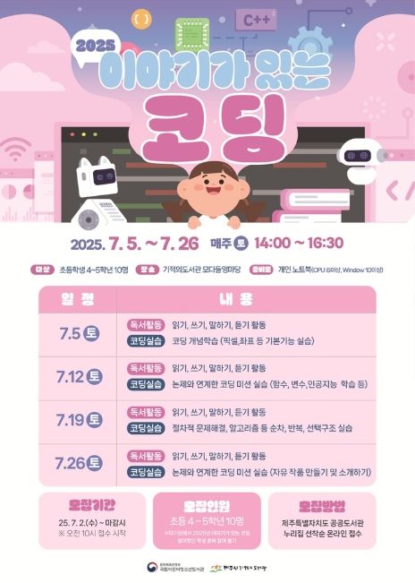 ㈜한국탑뉴스 한민석 기자 | 제주시기적의도서관은 7월 5일부터 초등학교 4~5학년 10명을 대상으로 ‘이야기가 있는 코딩’ 프로그램을 운영한다.