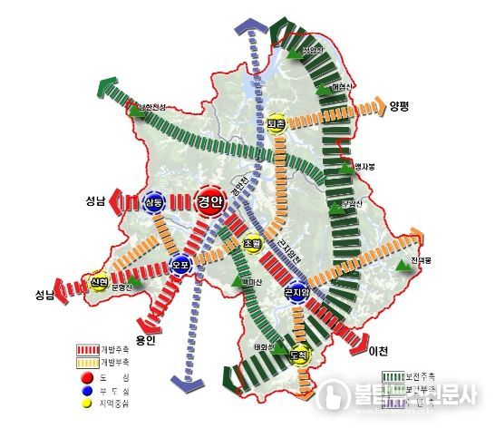 도시발전 축은 광주시의 개발추세, 토지이용 등 지역 특성을 고려해 도심(경안), 부도심(삼동, 오포, 곤지암), 지역중심(신현, 초월, 도척, 퇴촌)을 연계하고 성남, 용인, 이천으로 향하는 성장주축과 용인, 이천, 양평으로 향하는 성장부축을 계획했다.