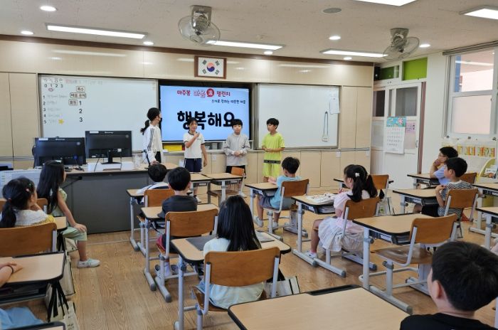 지난 7일부터 5학년 학생들이 직접 가족, 친구, 감사 표현 등 수어 단어를 설명하는 영상을 제작하고 아침 활동 시간을 활용해 1~3학년 학생들에게 수어의 의미와 표현 방법, 공모전 참여 방법을 안내하는 등 학생들이 주도적으로 참여하는‘함께 만들어가는 실천 활동’으로 운영되고 있다.