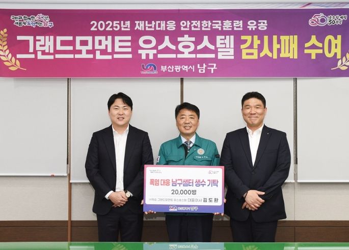 ㈜한국탑뉴스 송행임 기자 | 부산 남구는 7월 8일, ‘2025년 재난 대응 안전한국훈련’에 적극 협조하고, 폭염 대비 생수 2만 개를 기부한 그랜드모먼트 유스호스텔(대표이사 김도환)에 감사패를 수여했다.