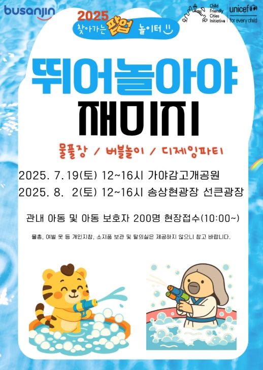 부산 부산진구는 오는 7월 19일 토요일 가야감고개공원, 8월 2일 토요일 송상현광장 선큰광장에서 “2025년 찾아가는 팝업 물놀 이터‘뛰어 놀아야 재미지!’”행사를 개최한다고 밝혔다.