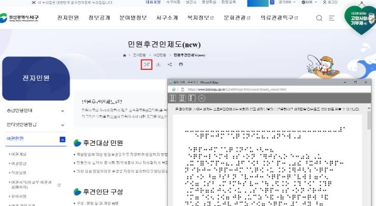㈜한국탑뉴스 송행임 기자 | 부산 서구는 부산 자치단체 가운데 최초로 시각장애인들을 위해 오는 15일부터 구 대표 누리집(홈페이지)에서 ‘전자 점자 생성 서비스’를 시행한다.