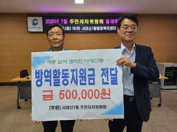 ㈜한국탑뉴스 송행임 기자 | 부산광역시 서구 서대신1동 주민자치위원회(위원장 정종영)는 지난 8일, 해충 없는 쾌적한 마을 조성을 위하여 서대신1동 주민자율방역단(새마을지도자협의회)에 방역활동지원금 50만원을 전달했다.