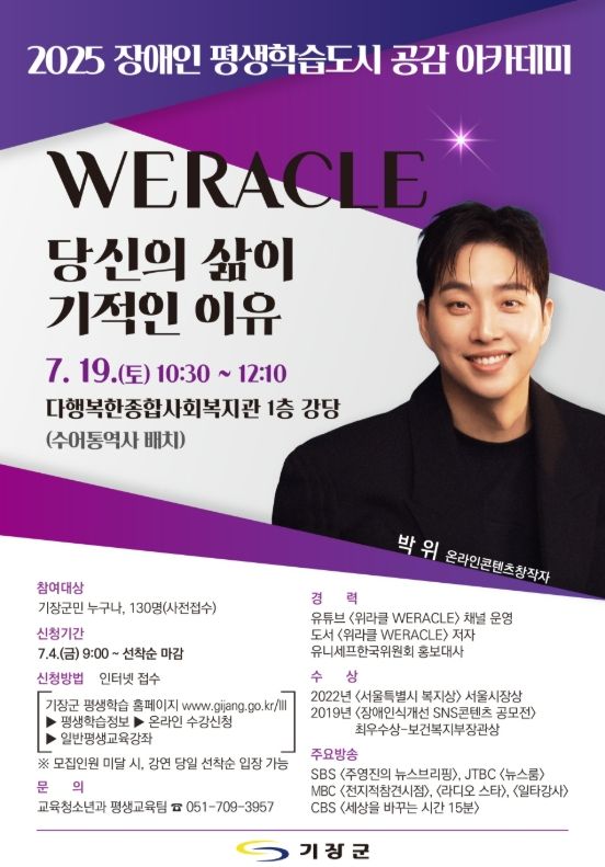 ㈜한국탑뉴스 송행임 기자 | 기장군은 오는 19일 오전 10시 30분 다행복한종합사회복지관 1층 강당에서‘2025 장애인 평생학습도시 공감 아카데미’ 강연을 개최한다고 9일 밝혔다.