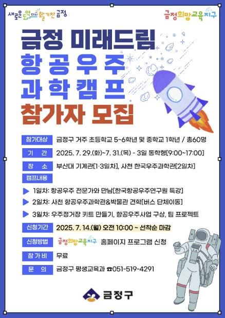 ㈜한국탑뉴스 송행임 기자 | 부산시 금정구는 항공우주 분야의 심화 탐구활동을 위한녩년 미래드림 항공우주 과학캠프' 참가자를 7월 14일 10시부터 금정희망교육지구 누리집을 통해 모집한다고 밝혔다.