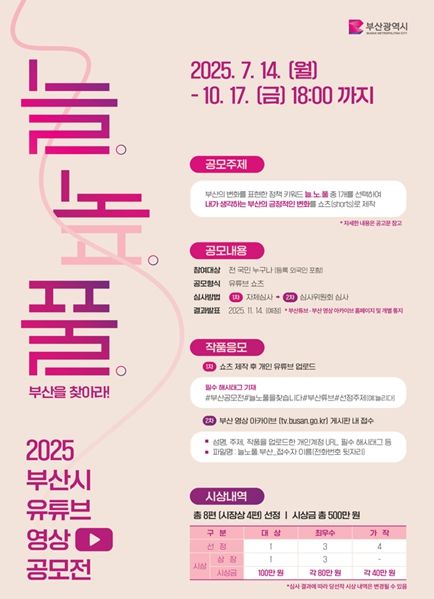 ㈜한국탑뉴스 송행임 기자 | 부산시는 오는 7월 14일부터 10월 17일까지 2025년 부산시 유튜브 영상 공모전 '늘. 노. 풀. 부산을 찾아라!'를 개최한다고 밝혔다.