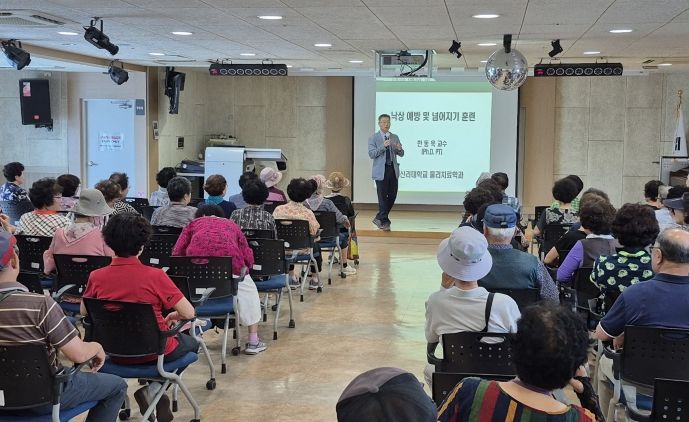 이번 강좌는 신라대 물리치료학과 한동욱 교수가 강연을 맡아 ▲낙상사고의 원인 ▲낙상예방을 위한 검사방법 ▲ 균형능력과 유연성을 증진할 수 있는 운동방법 소개 등 낙상사고 예방에 대한 정보를 제공했다.