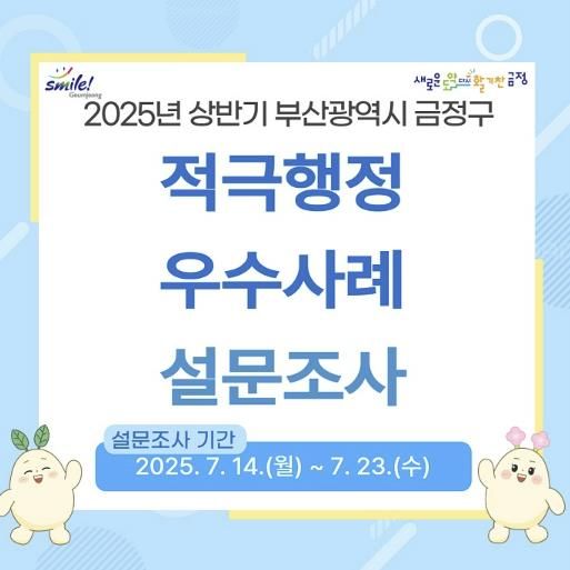 ㈜한국탑뉴스 송행임 기자 | 부산시 금정구는 구민이 만족하고 공감할 수 있는 적극행정 우수사례를 선정하고자 오는 23일까지 설문조사를 실시한다.