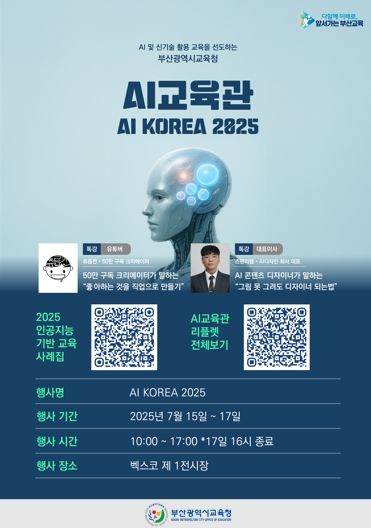 ㈜한국탑뉴스 송행임 기자 | 부산광역시교육청은 15일부터 17일까지 벡스코 제1전시장에서 열리는‘K-ICT WEEK in BUSAN 2025’행사에 인공지능 교육 사례 공유와 가치 확산을 위한 ‘AI 교육관’을 운영한다고 밝혔다.