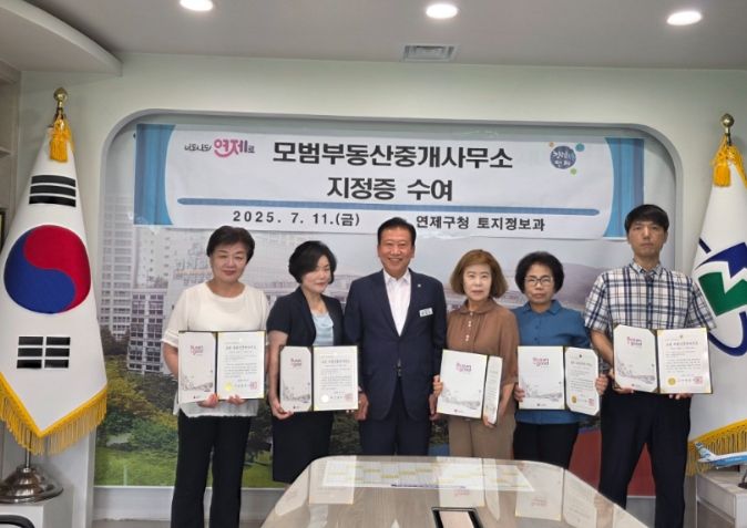 ㈜한국탑뉴스 송행임 기자 | 부산시 연제구는 7월 11일 관내 부동산중개업소 5개소를 대상으로 '모범 부동산중개사무소 지정증 전달식'을 개최했다.