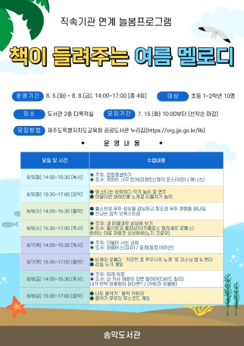 ㈜한국탑뉴스 차복원 기자 | 제주도교육청 송악도서관은 8월 5일부터 14일까지 도서관의 공간과 자원을 활용하여 학생들에게 안전하고 유익한 돌봄 환경을 제공하고 학습과 정서적 성장을 지원하기 위한 ‘책이 들려주는 여름 멜로디’ 늘봄 프로그램을 운영한다.