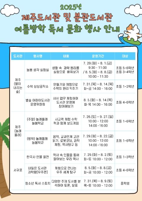 제주도서관 관계자는 “여름방학을 책과 함께 즐길 수 있도록 준비한 다채로운 프로그램을 통해 도서관에서 즐거운 추억을 만들기 바란다”고 말했다.