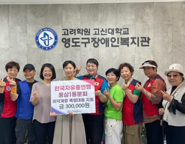㈜한국탑뉴스 송행임 기자 | 영도구 한국자유총연맹 동삼1동위원회는 지난 7월 11일 폭염으로 어려움을 겪고 있는 취약계층을 돕기 위해 지원금 30만원을 영도구장애인복지관에 전달했다.