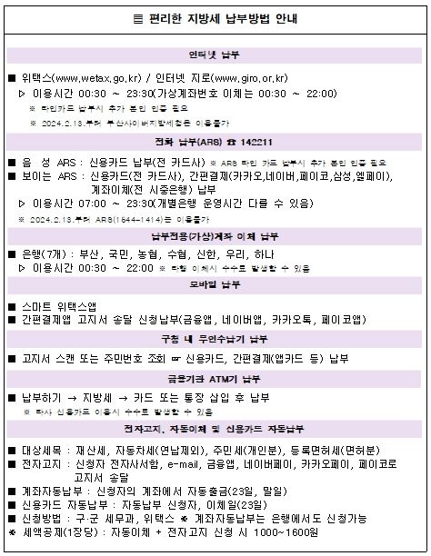 이외에도 납부 전용(가상) 계좌, 자동응답시스템, 은행(현금자동입출금기, 공과금수납기), 카카오페이 등을 통해서 납부할 수 있다.