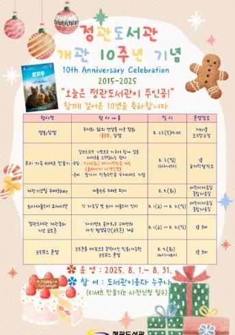 ㈜한국탑뉴스 송행임 기자 | 기장군은 정관도서관 개관 10주년을 맞아, 오는 8월 한 달간 다채로운 기념행사를 진행한다고 15일 밝혔다.