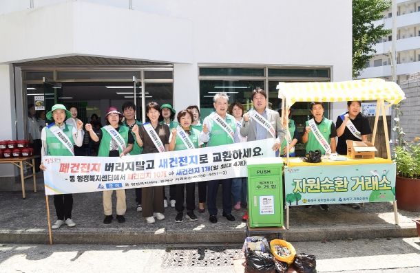 또한, 구청장을 비롯한 자원순환과 직원들이 참여해 직장과 가정 등 일상 속에서 무심코 버려지는 폐건전지를 57kg 수거하고, 새 건전지 229개를 교부했다.