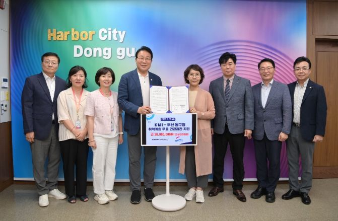 협약식에는 김진홍 동구청장과 KMI한국의학연구소 김순이 명예이사장, 이태근 ESG운영총괄단장, 최웅하 전무이사, 이재영 전무이사, 윤인근 KMI 부산검진센터장이 참석했다.