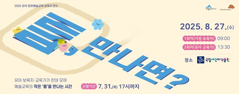 ㈜한국탑뉴스 한민석 기자 | 세종시문화관광재단은 2025년 유아 문화예술교육 보육자 연수 프로그램 '틈, 만나면?'의 참여자를 이달 31일까지 모집한다고 밝혔다.