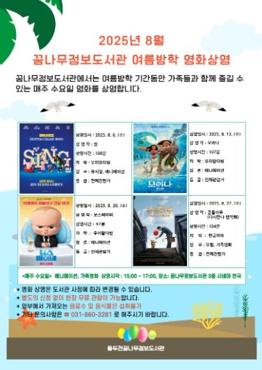 상영 예정인 영화는 ‘씽’, ‘모아나’, ‘보스 베이비’, ‘곰돌이 푸(다시 만나 행복해)’ 등 어린이와 가족을 위한 인기 애니메이션 4편이다. 영화는 꿈나무정보도서관 3층 시네마천국에서 매주 수요일 오후 2시 50분부터 선착순으로 입장해 관람할 수 있으며, 관람료는 무료이다.