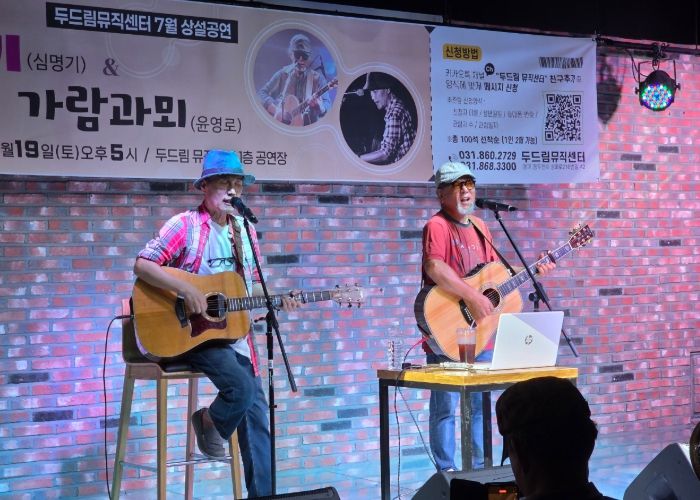 ㈜한국탑뉴스 한민석 기자 | 동두천시 두드림뮤직센터는 지난 19일 7월 상설공연에서 특별한 무대가 펼쳐졌으며, 포크 듀오 해바라기의 심명기 씨와 가람과뫼의 윤영로 씨가 함께해 관객에게 감동을 선사했다고 밝혔다.