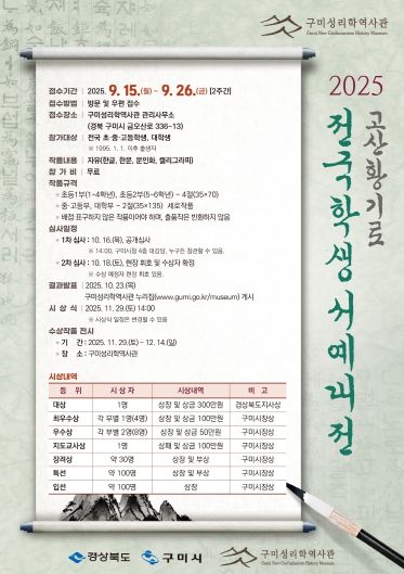 구미성리학역사관 관계자는 “이번 대전을 통해 전국의 학생들이 서예의 가치를 되새기고, 고산 황기로 선생의 예술혼을 이어가길 기대한다”며 “많은 학생들의 관심과 참여를 바란다”고 했다.