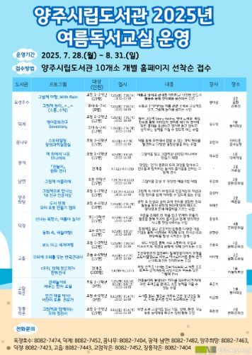 이번 여름독서교실은 7월 28일부터 8월 31일까지 양주시도서관 10개소에서 총 17개 강좌 및 전시로 진행된다.