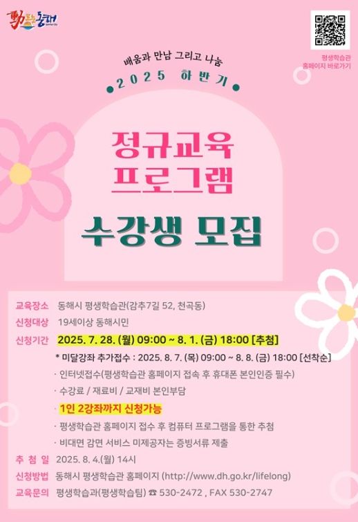 ㈜한국탑뉴스 송행임 기자 | 동해시는 평생학습을 통한 시민의 삶의 질 향상을 위하여 2025년 하반기 정규교육을 운영할 예정이다.