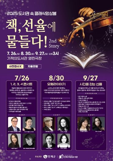㈜한국탑뉴스 한민석 기자 | 인제기적의도서관에서 오는 7월 26일 토요일 15시 ‘1,2,3,4 콘서트’를 시작으로 9월까지 매월 마지막주 토요일에 클래식 음악회 ‘책 선율에 물들다!’ 가 열린다.