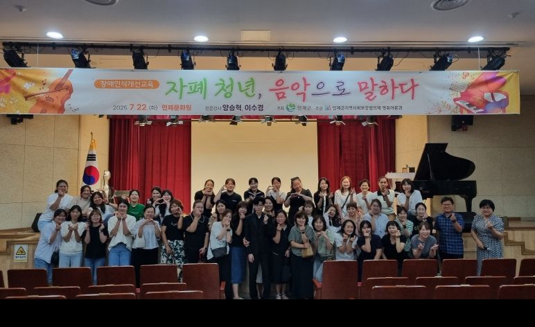 ㈜한국탑뉴스 송행임 기자 | 인제군지역사회보장협의체 영유아분과(위원장 김애자)는 7월 22일 화요일 관내 어린이집 종사자 70명을 대상으로 장애인과 비장애인이 더불어 행복한 사회를 꿈꾸는 양승혁‧이수경 전문강사로부터 스토리텔링 콘서트 형식의 “자폐청년, 음악으로 말하다.”라는 주제의 장애인식개선교육을 진행했다.