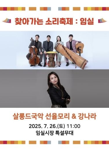 심 민 군수는“임실 출신 국악인 강나라 님과 복합 예술 창작 단체인 살롱드국악 선율모리가 함께하는 이번 공연은 지역 정체성과 예술적 감동을 동시에 담은 무대가 될 것”이라며“앞으로도 문화예술 활동에 활력을 불어넣는 다양한 기회를 마련하겠다”고 말했다.
