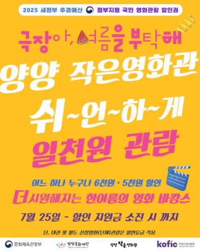 ㈜한국탑뉴스 송행임 기자 | (재)양양문화재단은 문화체육관광부와 영화진흥위원회에서 추진하는 '2025 국민 영화관람 활성화 지원사업'에 지원하여 참여 영화관으로 선정됐다.