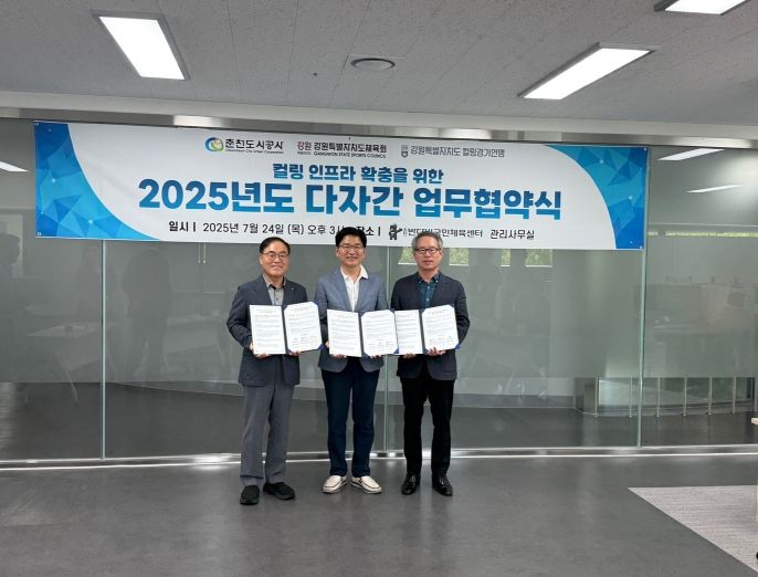 ㈜한국탑뉴스 송행임 기자 | 춘천도시공사는 24일 강원특별자치도체육회와 강원특별자치도컬링경기연맹과 함께 춘천 지역 컬링 종목 활성화와 인프라 확충을 위한 다자간 업무협약을 체결했다.