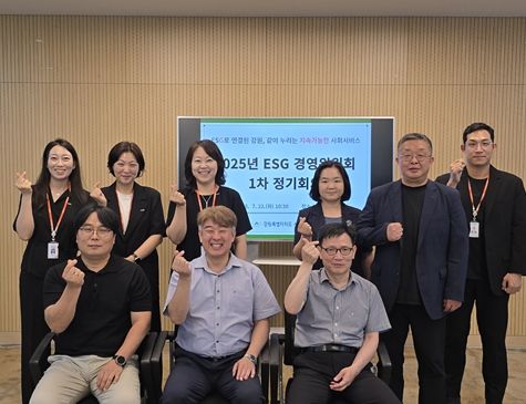 ㈜한국탑뉴스 송행임 기자 | 강원특별자치도 사회서비스원은 7월 22일 강원복지마루에서 2025년 환경·사회·지배구조(ESG) 경영위원회 1차 정기회의를 열고, 환경·사회·지배구조(ESG) 경영전략 실천과제 이행 현황 점검 및 성과 확산 방안을 논의했다.