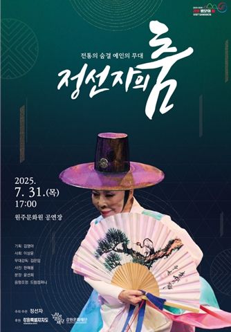 ㈜한국탑뉴스 송행임 기자 | 강원문화재단은 7월 31일 오후 5시 원주문화원 공연장에서 전통 무용가 정선자가 선보이는 한국 전통무용 공연 '전통의 숨결, 예인의 무대 – 정선자의 춤'을 개최한다.