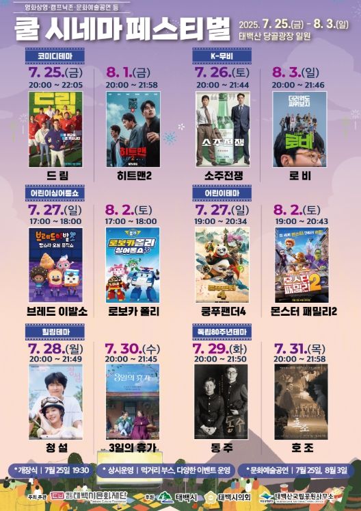 ㈜한국탑뉴스 송행임 기자 | 태백시는 오는 7월 25일부터 8월 3일까지 10일간 태백산국립공원 당골광장 일원에서 ‘2025 태백 쿨시네마 페스티벌’ 야외 영화 축제를 개최한다고 밝혔다.