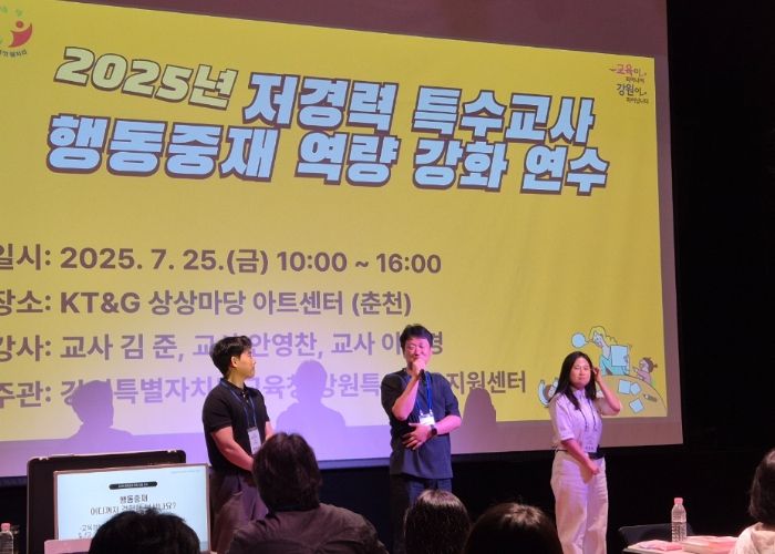 ㈜한국탑뉴스 송행임 기자 | 강원특별자치도교육청은 7월 25일 10시 춘천 KT&G 상상마당 아트센터에서 ‘2025 저경력 특수교사 행동중재 역량 강화’ 연수를 진행했다.