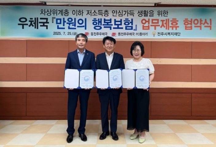 ㈜한국탑뉴스 한기석 기자 | 전주시복지재단(이사장 윤방섭)은 25일 동전주우체국(국장 김경일), 동전주우체국 FC동아리(회장 송해숙)와 저소득 취약계층을 지원하기 위한 만원의 행복 보험 가입 및 사회공헌 업무 협약을 체결했다.